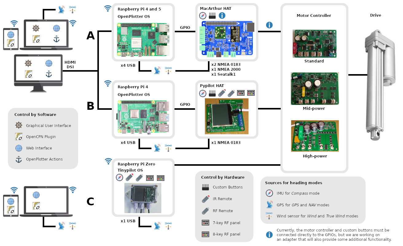 There are different ways to implement an OpenPlotter based system. I am going for option 2 with MacArthur Hat, since that requires least hardware interfacing and can easily connect to Seetalk 1, Seetalk 2, NMEA2000 and other bus systems.
