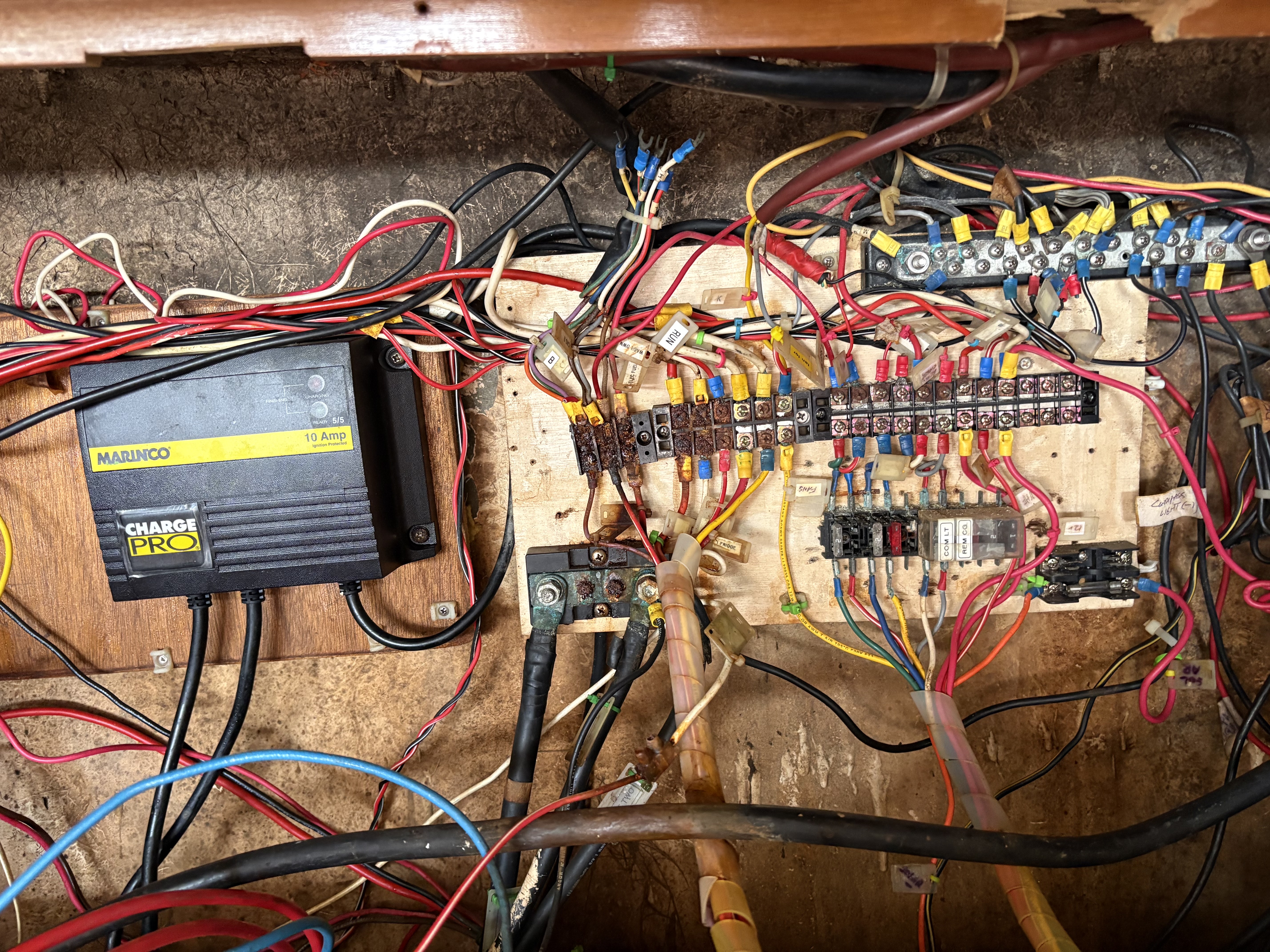 The board that contains the terminal strips looks even worse. Also see all the free hanging wires, from stuff that was added during the lifetime of the boat. At some point the boat had a generator and an aircon, therefore there were many components of a 220V (or 110?) system of some sort. The thick black and blue cables for example in the picture were from that added components.