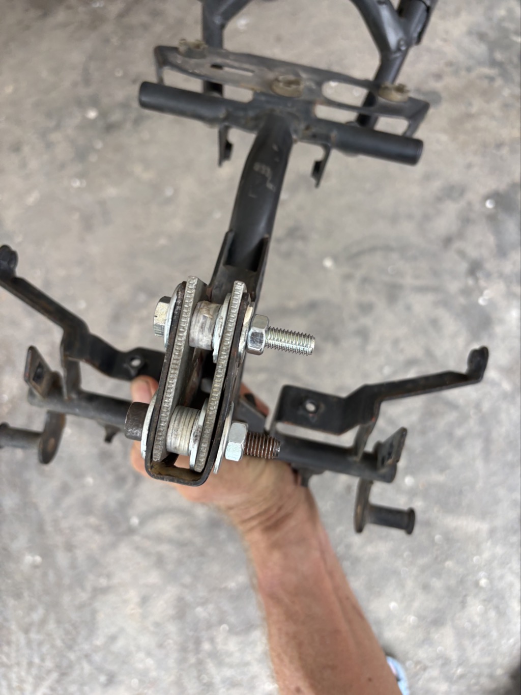 Ich versuche die Lenkerverkleidung zurückzubiegen, geht nicht. Also Werkzeug raus und die Scheibe, die mit dem Kupplungshebel kollidiert, abmontieren. Dann bitte ich die zwei Frauen, die inzwischen ihr Auto auch in die Hauseinfahrt gefahren haben (es sitzen noch zwei weitere Frauen drin), das Motorrand festzuhalten während ich biege. Das geht. Wir bekommen das soweit hin dass sich wieder lenken lässt, allerdings nur ohne Scheibe.