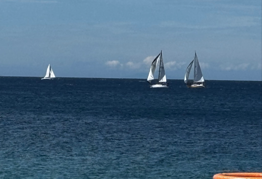Sailing was great fun, first running down to White Beach, jibing around the marker buoy there, then tacking back towards Long Beach, passing the second marker, then rounding third and back to the second running, around it and then towards the finishing line.
